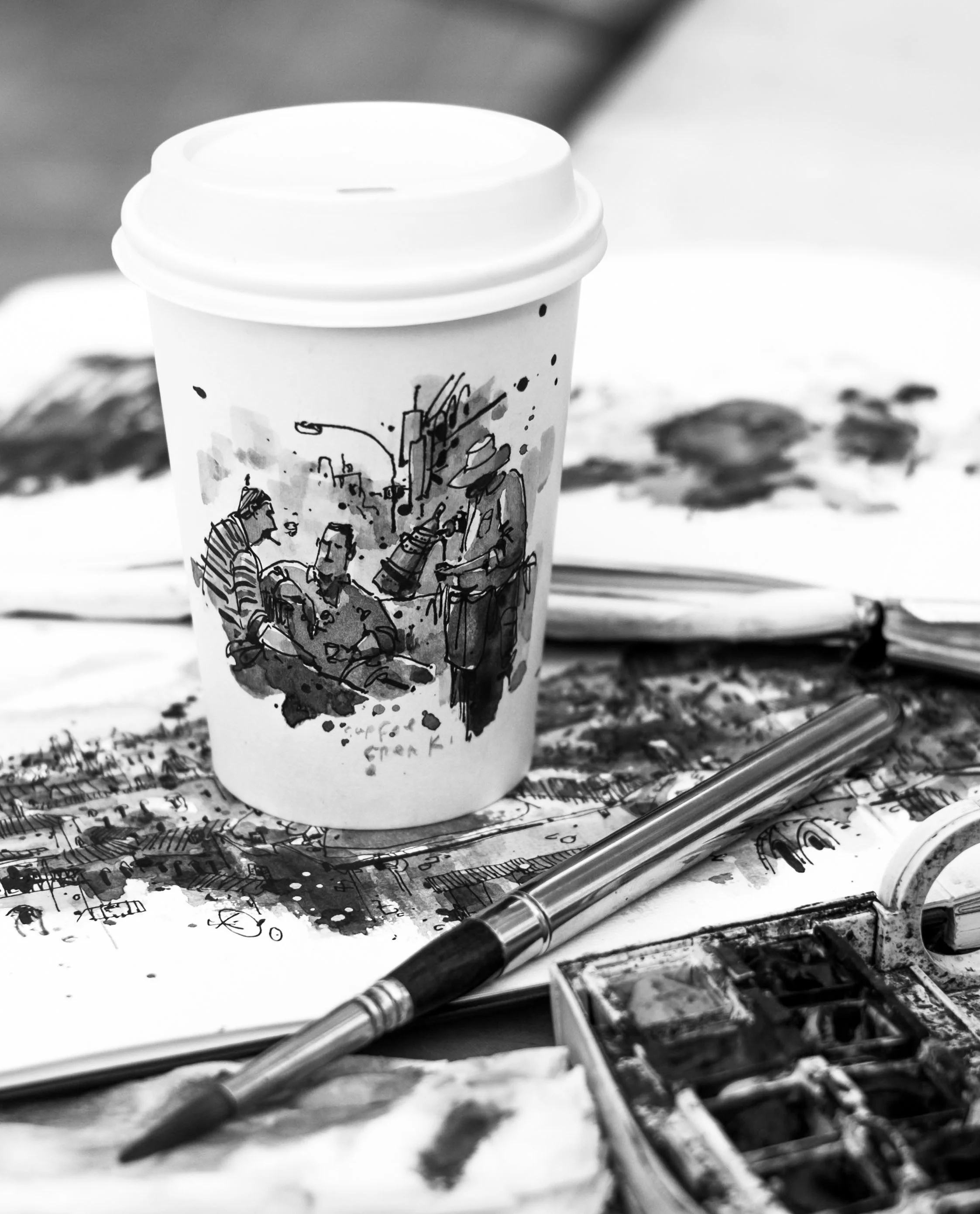 I spent the winter of 2019 sketching from scenes I found on my way to work. I started working on recycled paper coffee cups as a way to market the sale of coffee at my skateshop, Birling.